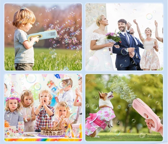 Perfetta per il giardino, compleanni, matrimoni e giochi con gli animali. Le bolle creano un’atmosfera magica ovunque.