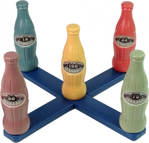 2 supporti in plastica (base a croce), 5 bottiglie con punteggio, 5 anelli da lancio