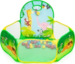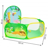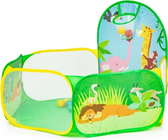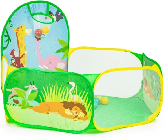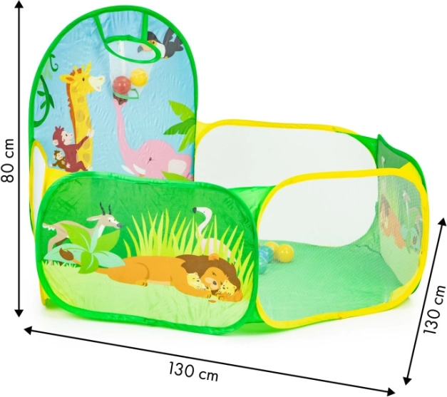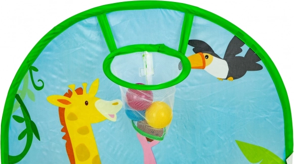 Nella confezione sono incluse 50 palline di plastica (Ø 6 cm), che trasformano la tenda in una divertente piscinetta a secco. Il canestro per lanci integrato motiva al movimento, sviluppa coordinazione e precisione. Il pavimento resistente è pronto per il gioco in interno e all’esterno.