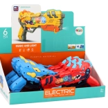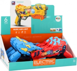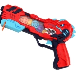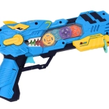 Divertente pistola per bambini a forma di dinosauro che proietta immagini di dinosauri e offre effetti luminosi e suoni realistici. Premendo il grilletto, le ruote illuminate iniziano a girare, la pistola “prende vita” e sulla parete appare la proiezione del dinosauro. Un ottimo giocattolo per stimolare creatività e motricità fine. Disponibile in due colori – blu e rosso.