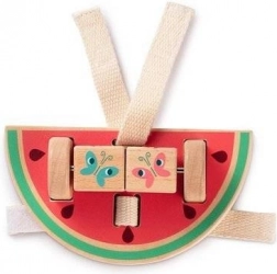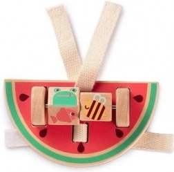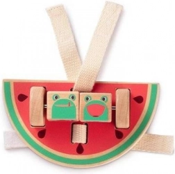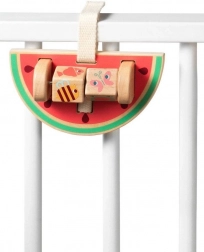 Un giocattolo colorato a forma di anguria, con asta metallica e blocchi rotanti, offre divertimento e supporta lo sviluppo della motricità fine nei bambini.