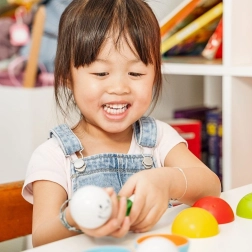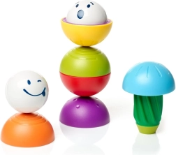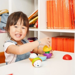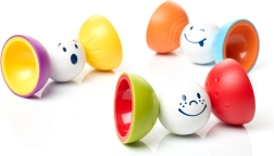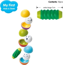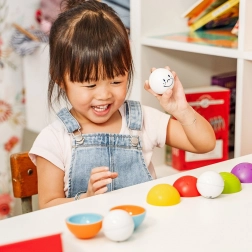 Facce allegre e colori vivaci motivano i bambini ad assemblare, ordinare e giocare a nascondino con le palline.