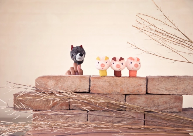 Tre porcellini colorati e un lupo grigio come burattini da dito in morbido tessuto. Piacevoli al tatto, ideali per scenette a casa e all'asilo.