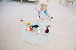 Questo gioco di bowling in tessuto sviluppa la motricità fine (presa, lancio), favorisce strisciare e gattonare e insegna ai bambini le relazioni di causa–effetto. Grazie ai materiali morbidi, il gioco è sicuro e silenzioso – ideale per la cameretta o il soggiorno. Un’ottima idea regalo per piccoli esploratori.