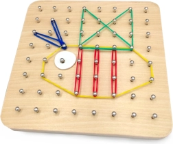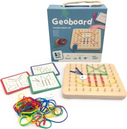 Geoboard è un giocattolo interattivo ed educativo per bambini dai 4 anni, che sviluppa la motricità fine e la creatività. Con elastici colorati e chiodi metallici, i bambini possono facilmente creare diverse forme e figure.