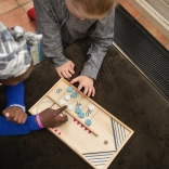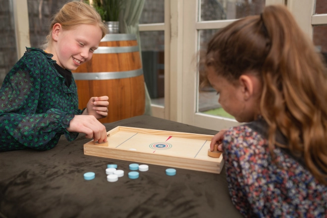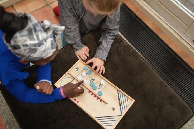 Hockey da tavolo e gioco matematico per bambini offrono il doppio del divertimento! Nella prima parte del gioco, i due giocatori devono mirare i loro gettoni sul campo bersaglio. Nella seconda parte, si sfidano nell'hockey da tavolo fino a che uno dei giocatori non segna sette goal. Entrambi i giochi sono progettati per supportare il coordinamento occhio-mano e sviluppare le competenze numeriche.