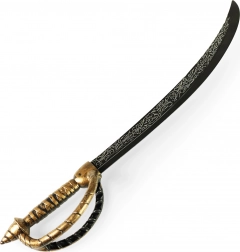 Sciabola curva in plastica con motivi decorativi argentati e impugnatura nero-oro, offre una presa comoda e sicura per il gioco dei bambini.