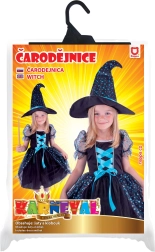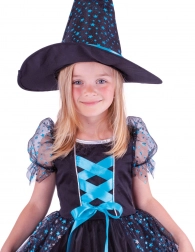 Un incantevole costume da strega per bambina in nero e blu che trasforma ogni piccola maga nella stella della festa. L'abito brilla con stelline metalliche, è decorato con un nastro turchese e include anche un cappello da strega coordinato. Ideale per carnevale, Halloween e travestimenti fiabeschi.