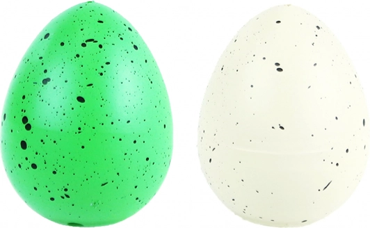 Ogni uovo ha un design unico verde con macchie nere e nasconde un dinosauro dai colori vivaci.