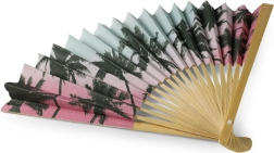 Il ventaglio colpisce per il suo motivo tropicale di palme su sfondo colorato, che porta freschezza e un tocco esotico a ogni giorno.