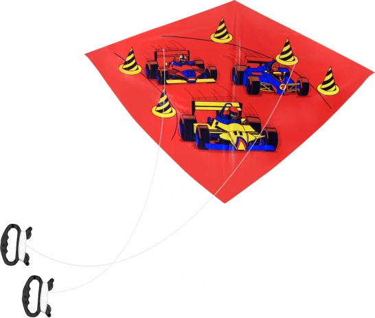L'aquilone è decorato con motivi di auto da corsa e coni stradali, che aggiungono un aspetto giocoso e avventuroso.