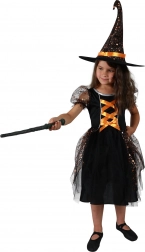Il costume nero con nastri arancioni e stelle metalliche offre un look elegante per ogni piccola strega.