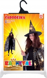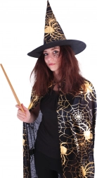 Entra nel mondo della magia con questo elegante set da strega per adulti: un mantello nero con motivi dorati di ragnatele e un cappello a punta coordinato creano un costume mistico, d’impatto e fotogenico per Halloween, carnevali e feste a tema. Il materiale leggero garantisce comfort per tutta la serata. La bacchetta non è inclusa nella confezione.