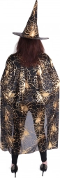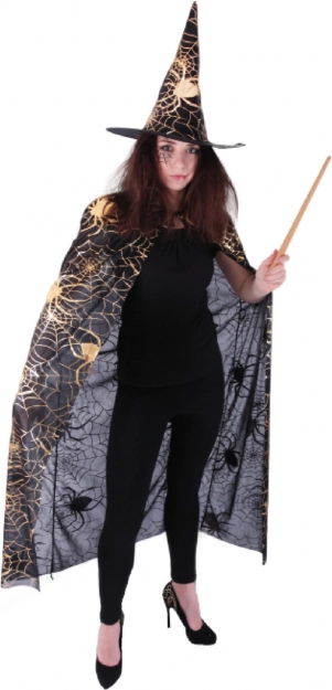 Un elegante mantello da strega e cappello con lucida stampa dorata di ragnatele trasformeranno ogni serata in costume in un evento magico. Grazie al taglio universale e al materiale leggero, è comodo da indossare e facile da abbinare ad altri accessori. Ideale per Halloween, feste in maschera, cosplay e servizi fotografici a tema.