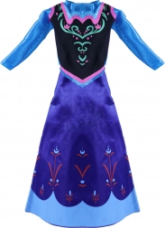 L'abbigliamento è colorato di blu e viola con complessi motivi floreali.