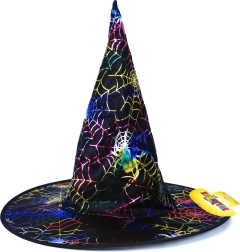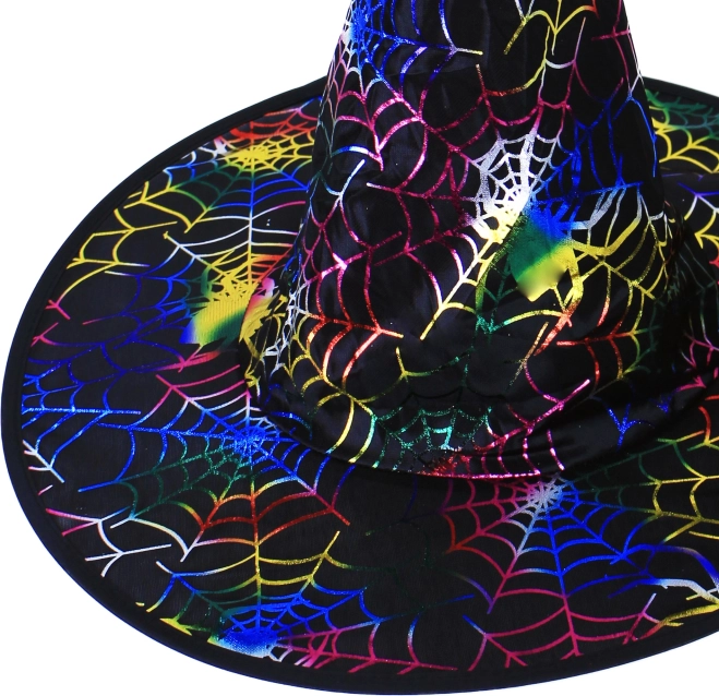 Dai un tocco unico al tuo costume di Halloween o di carnevale con l’elegante cappello da strega nero decorato con ragnatele colorate. Il materiale leggero e flessibile è comodo da indossare, mentre la tesa larga e la punta conica creano una silhouette iconica.