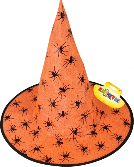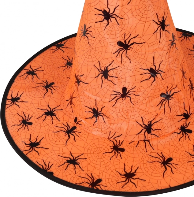 Entra nel mondo della magia con un vistoso cappello da strega in un arancione intenso. La forma conica, l'ampia tesa e i dettagli neri a contrasto con motivi di ragnatele e ragni donano al tuo costume il giusto tocco spettrale.