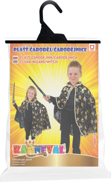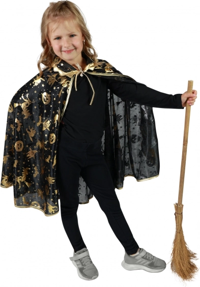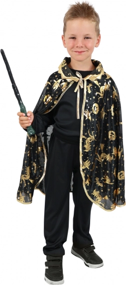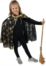 Mantello da strega/stregone per bambini in nero con stampa dorata di stelle, lune e altri motivi che trasforma all’istante ogni bimbo in un piccolo mago. È leggero, confortevole e si indossa facilmente grazie al laccio da annodare al collo.
