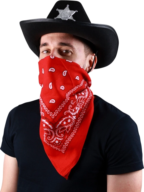 Questo elegante fazzoletto rosso con un motivo cowboy è un accessorio straordinario per tutte le feste in maschera! È un pezzo eccezionale per completare il tuo look da cowboy.