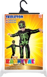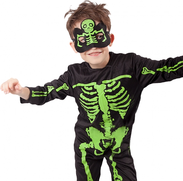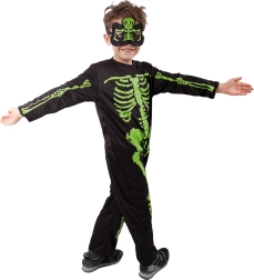 Elegante costume da scheletro per bambini con ossa verde neon ben visibili su sfondo nero. Ideale per Halloween, carnevale e feste a tema. Include tuta e maschera per un look spettrale completo. Materiale confortevole, facile da indossare e stampa neon d'effetto per tanto divertimento e attenzione.