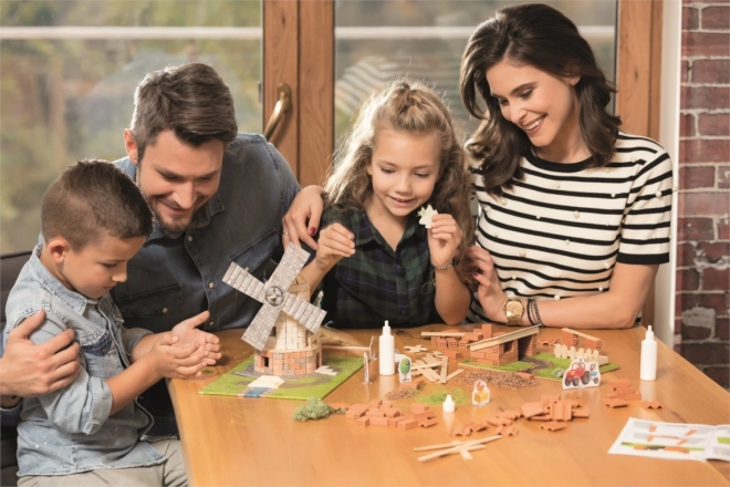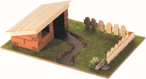- oltre 30 mattoncini d’argilla naturali, oltre 1,8 m di listelli di legno, base, istruzioni illustrate, figurine di carta, accessori decorativi, colla