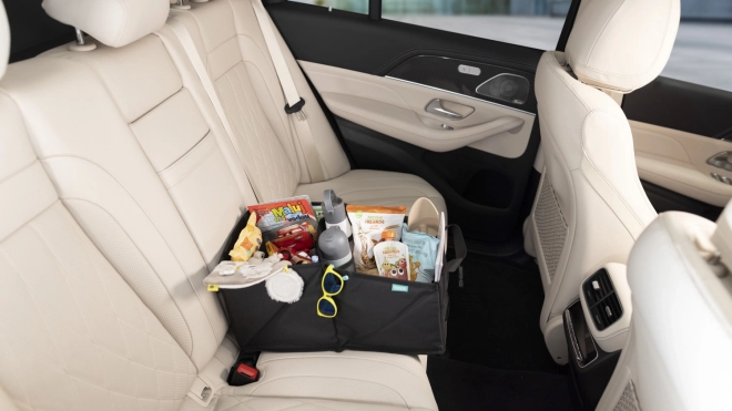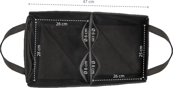 Dispone di diverse tasche portaoggetti per riporre bevande o bottiglie, o altri piccoli oggetti, e di una tasca con cerniera. Due ampi scomparti offrono spazio sufficiente per conservare in modo ordinato tutto il necessario durante i viaggi.