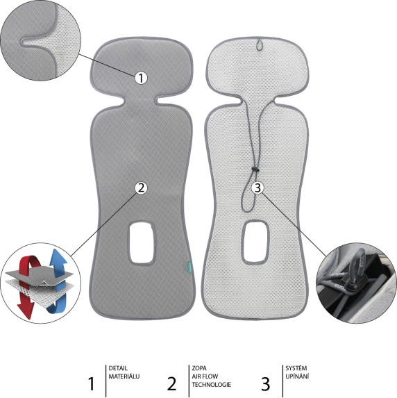 La traspirabilità è garantita dall’esclusiva tecnologia Zopa Air Flow, un tessuto con struttura esagonale 3D che consente il flusso d’aria attraverso l’inserto, tra il seggiolino auto e il bambino.