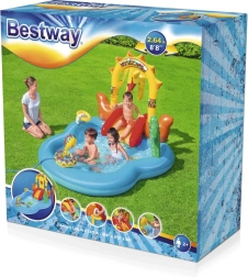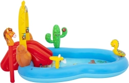 Trasforma il giardino in un paradiso western per bambini con il centro giochi gonfiabile Bestway. Offre una piscina con capacità di 278 l, uno scivolo rimovibile con arrivo morbido, un irrigatore a forma di serpente per rinfrescarsi e giochi con anelli. Collegamento facile al tubo da giardino e rapido svuotamento dell’acqua grazie alla valvola per un utilizzo semplice. Ideale per bambini dai 2 anni in su.