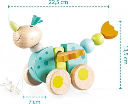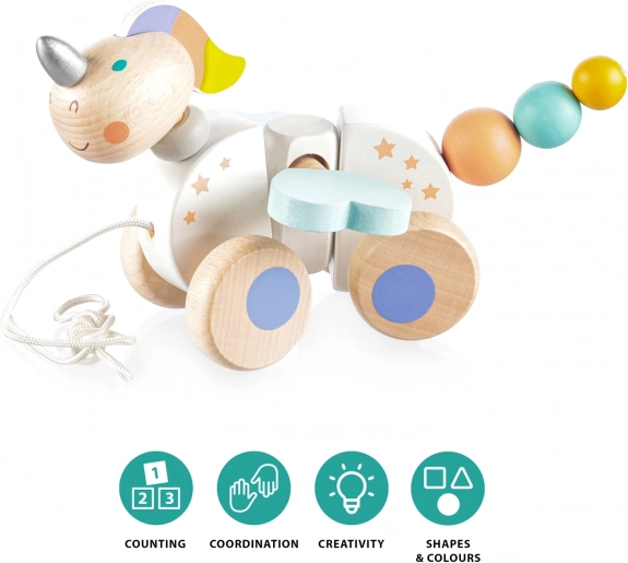 Il giocattolo trainabile in legno Unicorno è un ottimo compagno per i bambini nei loro primi passi. Grazie al semplice meccanismo, batiotterà le ali e la coda mentre cammina, intrattenendo i bambini per molte ore.