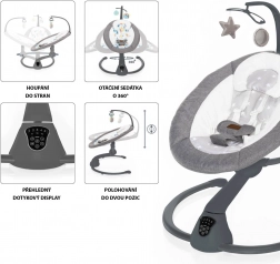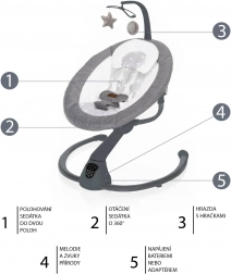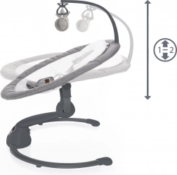 Il controllo è intuitivo tramite un chiaro pannello touch o con il telecomando incluso. Il sedile morbido e riccamente imbottito con due posizioni e la sicura cintura a 5 punti assicurano comfort anche durante riposi più lunghi. Inclusi un archetto con due morbidi giochini peluche rimovibili e rilassanti melodie e suoni della natura con regolazione del volume.