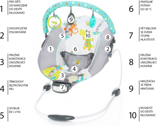 La sdraietta Happy offrirà al vostro piccolino tanti nuovi stimoli, per questo la amerà di certo. Il suo elemento portante è la struttura flessibile, che il bambino può “far dondolare” con i propri movimenti. Nel frattempo, la cintura di sicurezza a 3 punti e i piedini antiscivolo garantiscono la sua sicurezza. L’attenzione del bambino è catturata anche dall’adorabile archetto giochi con 3 giochi lavabili, che sviluppano i sensi e la motricità fine. La regolazione a 2 livelli offrirà al vostro tesoro una seduta confortevole e la migliore visuale.