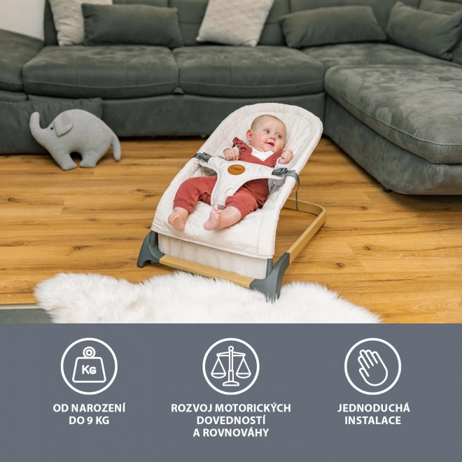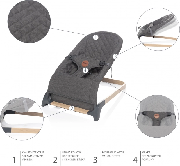Grazie alla struttura metallica solida ma flessibile, la sdraietta permette un dondolio basato sul peso del bambino oppure può essere fatta dondolare dai genitori. Il dondolio risulta così del tutto naturale. Il bebè impara rapidamente come dondolarsi nella sdraietta, sviluppando capacità motorie ed equilibrio.