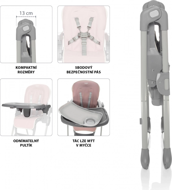 Un seggiolone che si adatta pienamente alle esigenze dei genitori e dei bambini. La struttura solida e stabile è molto leggera e può essere facilmente ripiegata tramite due blocchi di sicurezza laterali. Una volta chiuso, resta in piedi da solo. Grazie alle dimensioni compatte, il seggiolone piegato può essere riposto anche in spazi ridotti. Da chiuso ha una larghezza di soli 13 cm.