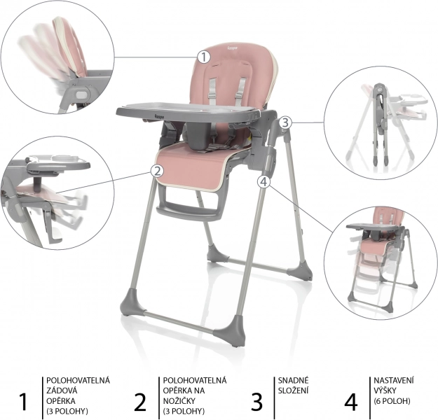 Il seggiolone può essere regolato facilmente per offrire la massima comodità di seduta. Lo schienale regolabile può essere posizionato in 3 inclinazioni. È possibile regolare l’altezza in 6 diverse posizioni. Regolabile anche il poggiapiedi. Nel vassoio removibile è inserito un piattino interno che può essere estratto separatamente. Il rivestimento del seggiolone è lavabile e, in caso di sporco, è sufficiente passarlo con un panno umido. Per la massima sicurezza del bambino, il seggiolone è dotato di una cintura di sicurezza a 5 punti.