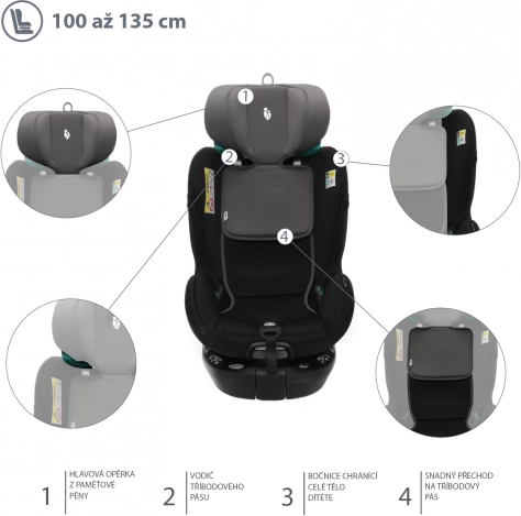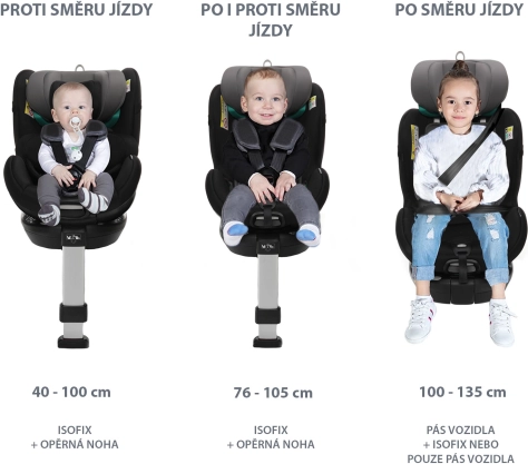 Dalla nascita fino a 19,5 kg i bambini sono protetti dalla cintura di sicurezza a 5 punti con fibbia Immi di alta qualità. In questa fase il seggiolino si installa con isofix e gamba di supporto. I bambini possono viaggiare in senso contrario di marcia fino a 105 cm. Grazie alla rotazione, dai 76 cm è possibile scegliere anche il senso di marcia. Quando il bambino cresce, si passa facilmente al fissaggio con la cintura a 3 punti del veicolo. La gamba di supporto si ripiega sotto il seggiolino. Il vostro bambino è perfettamente protetto dalla nascita fino a 135 cm.