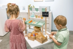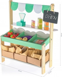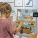 Attrezzatura commerciale completa - tutti gli accessori necessari sono inclusi nel set. Troverai cassette di legno, bilancia, lista della spesa e soldi. I bambini possono immedesimarsi nel ruolo di commercianti e clienti e imparare come funziona l'ambiente del mercato.