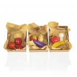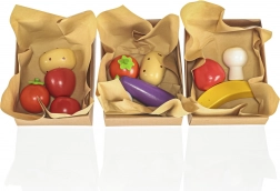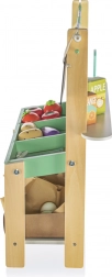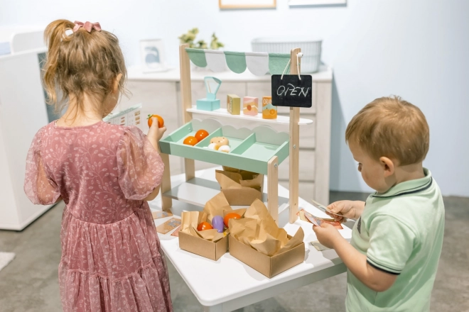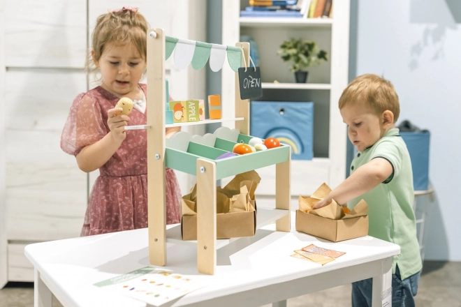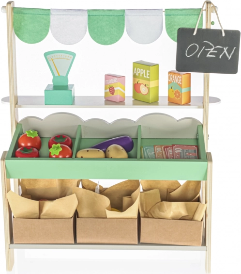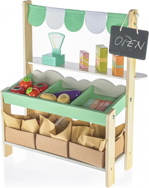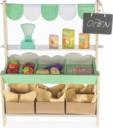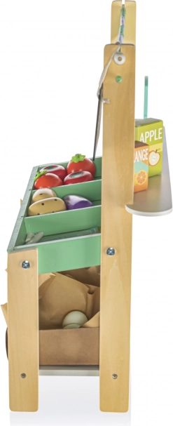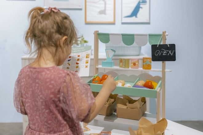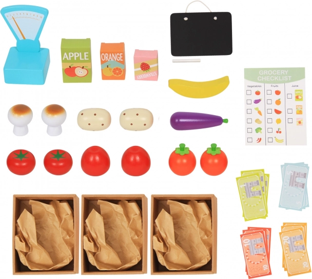 Il set include tutto ciò che serve per vendere al mercato - frutta e verdura in legno, bilancia e lista della spesa.