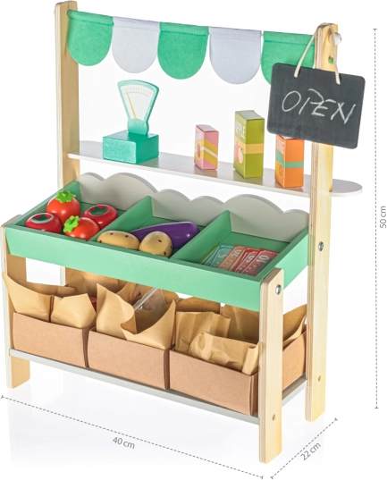 Bancarella di mercato in legno piena di divertimento - progettata per ispirare la creatività e il gioco di ruolo tra i bambini. I materiali in legno sicuri e di qualità garantiscono una lunga durata. I bambini si divertiranno per ore organizzando il loro mercato non solo a casa ma anche fuori in terrazza.