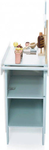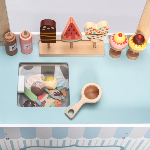 La bancarella dei gelati mobile in legno è lo strumento ideale per lo sviluppo dell'immaginazione e delle competenze sociali dei bambini. Questo set accuratamente progettato è dotato di tutte le attrezzature necessarie, comprese delizie di gelato realistiche e un congelatore per mantenere il gelato sempre fresco. I bambini possono giocare a fare i gelatai e creare deliziose prelibatezze gelate.