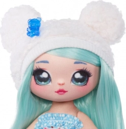 Bambola con grandi occhi espressivi e capelli turchesi, con un cappello peloso con orecchie da orso, attrae i bambini al gioco e al coccolamento grazie al suo aspetto vivace.