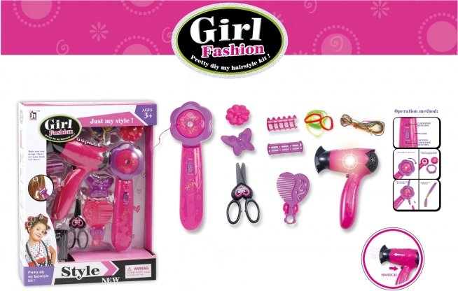 Diventa una piccola parrucchiera con questo set per capelli per bambine! Il set contiene tutto il necessario per creare acconciature originali per le feste – dall'intrecciatura dei fili di cotone fino all'asciugacapelli e i bigodini.