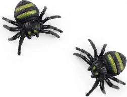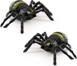 Due ragni di plastica con corpi neri e strisce verdi sul dorso, ideali come decorazioni o accessori per Halloween.