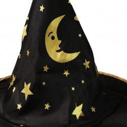 Il cappello da strega classico con eleganti motivi dorati di stelle e lune dona un fascino magico ai partecipanti.