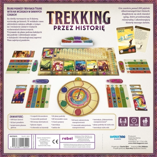 Trekking attraverso la storia è un gioco strategico per tutta la famiglia che porta i partecipanti in un viaggio unico tra gli eventi più significativi della storia. Durante la partita sceglieremo speciali carte Storia e cercheremo di mantenerle nel giusto ordine per ottenere il maggior numero di punti. Grazie alla disposizione variabile degli elementi e alle singole plance obiettivo, il gioco rimane coinvolgente anche dopo diverse partite, mentre le illustrazioni atmosferiche e le descrizioni degli eventi storici gli conferiscono un carattere educativo.