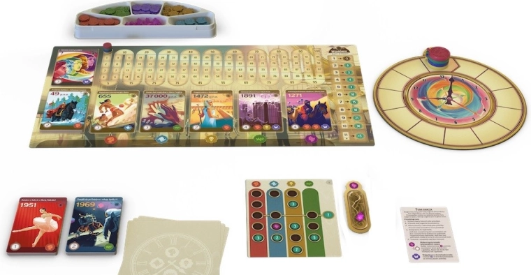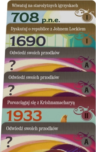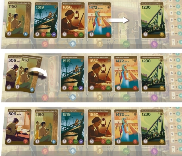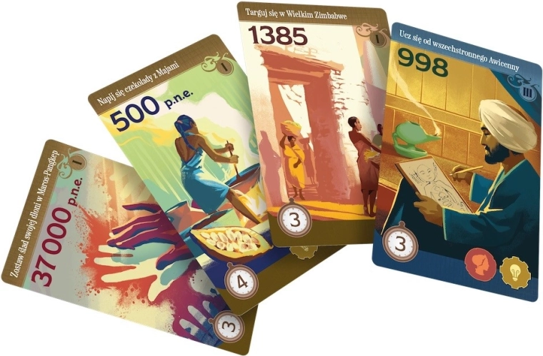 Sul tabellone vi attendono carte Evento verso le quali potete spostarvi. La valuta del gioco è il tempo, indicato su speciali orologi, e il costo della carta dipende dalla sua posizione. Se tenete particolarmente a una carta, potete avanzare ulteriormente sul tracciato degli orologi, ma ricordate che essi svolgono un ruolo fondamentale nel determinare l’ordine dei turni. In questo gioco non si agisce a rotazione fissa: è attivo il giocatore che si trova più indietro sul tracciato del tempo. Una mossa apparentemente molto vantaggiosa può rivelarsi meno attraente se consideriamo che, a causa nostra, gli avversari potrebbero giocare due turni di seguito prima di raggiungerci.