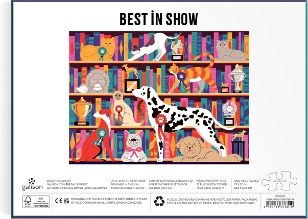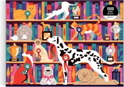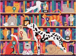 Il puzzle offre illustrazioni vivaci di cani e gatti in mostra sugli scaffali con trofei, aggiungendo una nuova dimensione di divertimento al gioco.