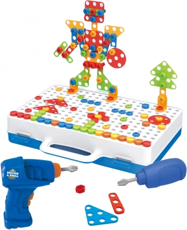 Il set contiene 248 pezzi, inclusi trapano a batteria, che permette di avvitare e svitare pezzi in forme piatte e tridimensionali. Sono inclusi anche un cacciavite e varie viti colorate e rondelle, che stimolano la percezione sensoriale e invitano al gioco.