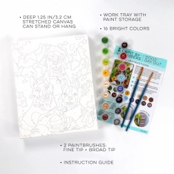 Nella confezione trovi tutto il necessario: tela profonda montata su telaio (8 × 10 pollici), 16 colori acrilici in vasetti, 2 pennelli e istruzioni semplici. Ti basta aprire la scatola e iniziare a dipingere.