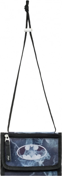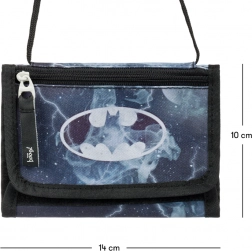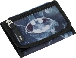 Il portafoglio presenta un motivo blu-nero con fumi e motivi notturni, perfettamente completato dal simbolo di Batman.