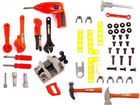 Il set include più di 50 pezzi: trapano a batteria, morsetto, sega, martello, ascia, pinze, mazzuolo di gomma, cacciavite, chiave e altri accessori come viti, dadi, connessioni e ganci.